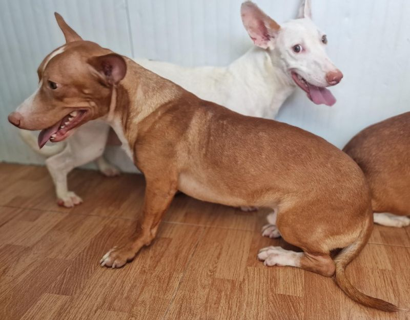 Atos is een kleine hond (Podenco Maneto): hij is ca. 36 cm hoog en weegt ca. 8 kg.