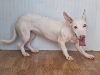 Ayka is een kleine hond (Podenco Maneto): zij is ca. 36 cm hoog en weegt ca. 12 kg.