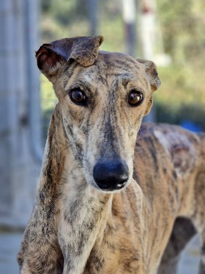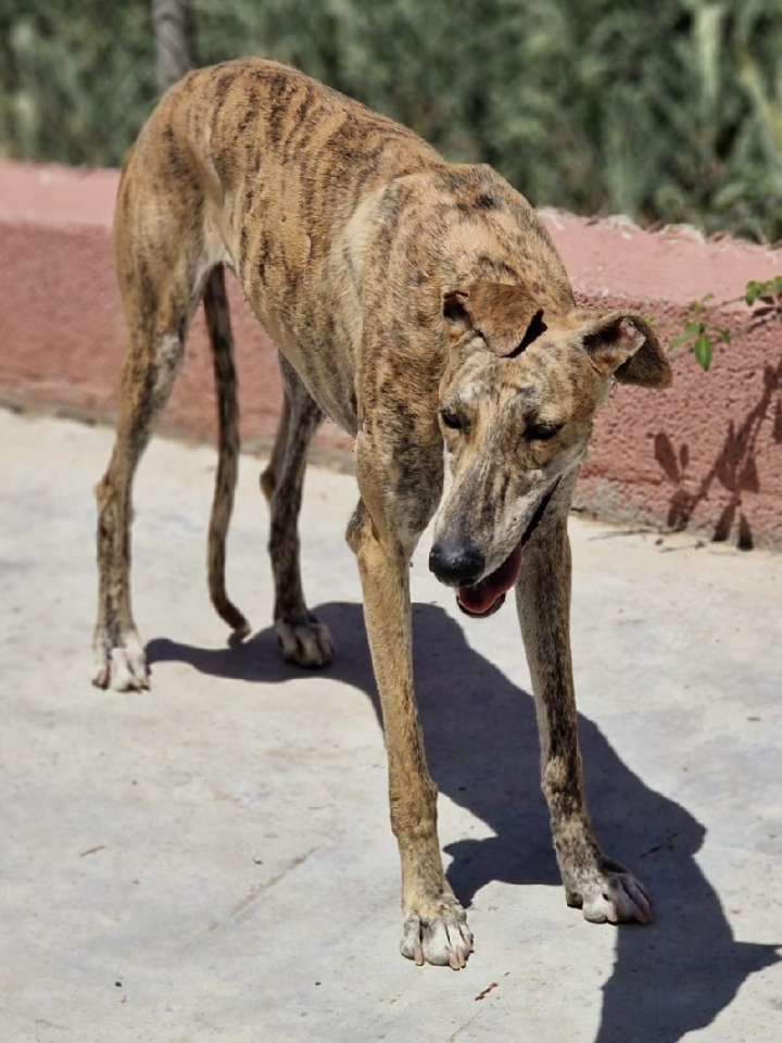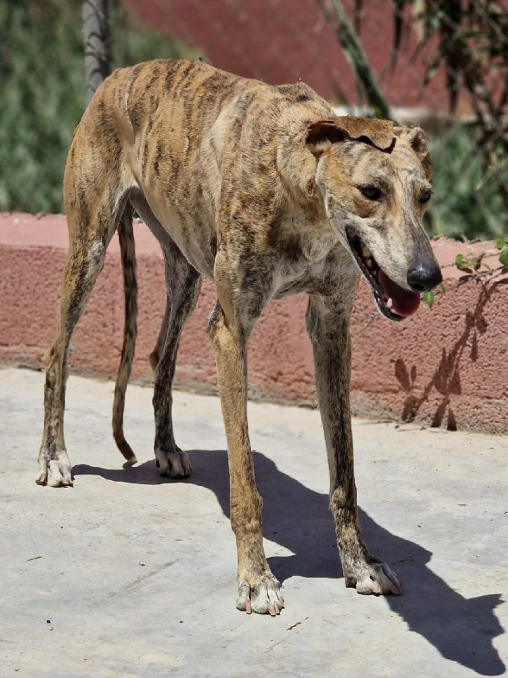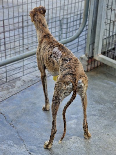 Na elk transport gaat het weer los. Ook al is de camion nog maar net vertrokken, mensen staan gewoon aan de deur aan te schuiven om hun hond of kat te kunnen afgeven nu er weer enkele plaatsen vrij kwamen, het is werkelijk onvoorstelbaar. Zo kwam ook deze Galgo binnen, mager, verwaarloosd, en duidelijk mishandeld. Het zoveelste slachtoffer van een jager.
